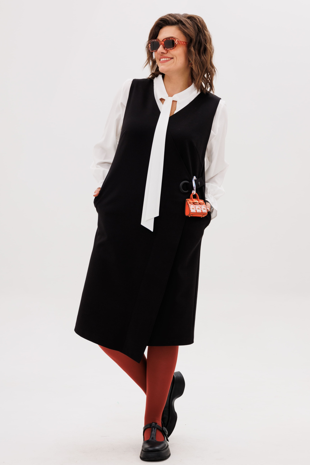Этот сарафан, выдержанный в строгом прямом силуэте, становится идеальной основой для современного гардероба. Его лаконичную геометрию мягко нарушает игра асимметрии — динамичный, неровный край низа плавно скользит по фигуре, создавая ощущение движения и художественной небрежности. Глубокий V-образный вырез горловины не только зрительно вытягивает шею, но и привносит ноту женственности и открытости, служа идеальным фоном для любимой блузки или тонкого джемпера.