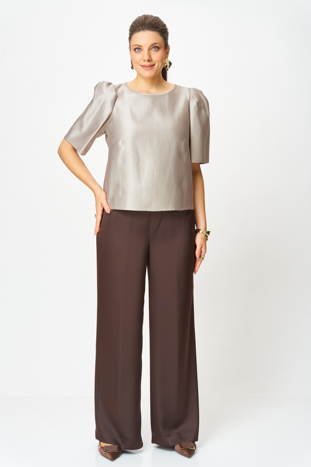 Брюки свободного силуэта, прямые к низу, выполнены из атласной ткани, брюки без застежки, верх брюк на поясе с резинкой.