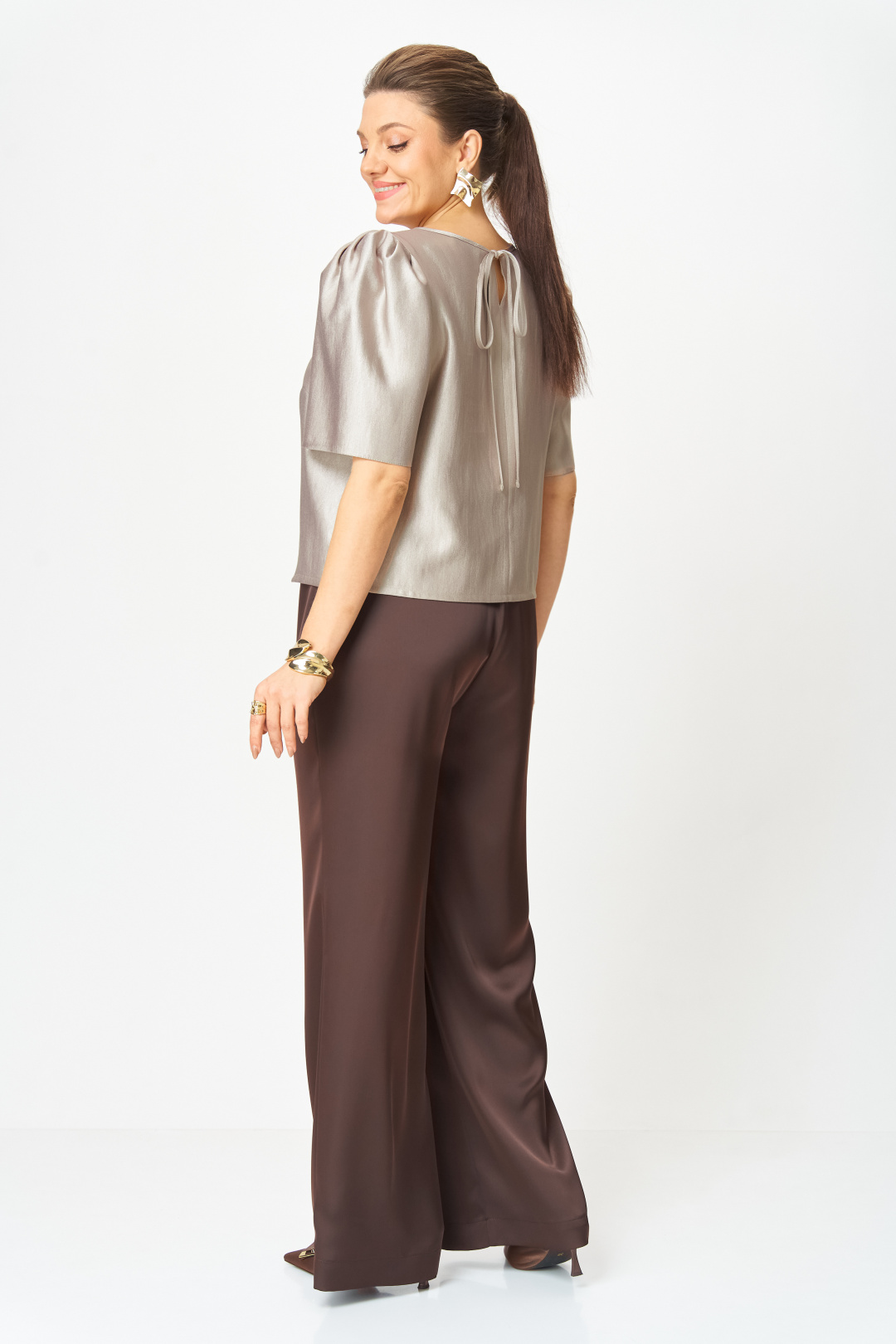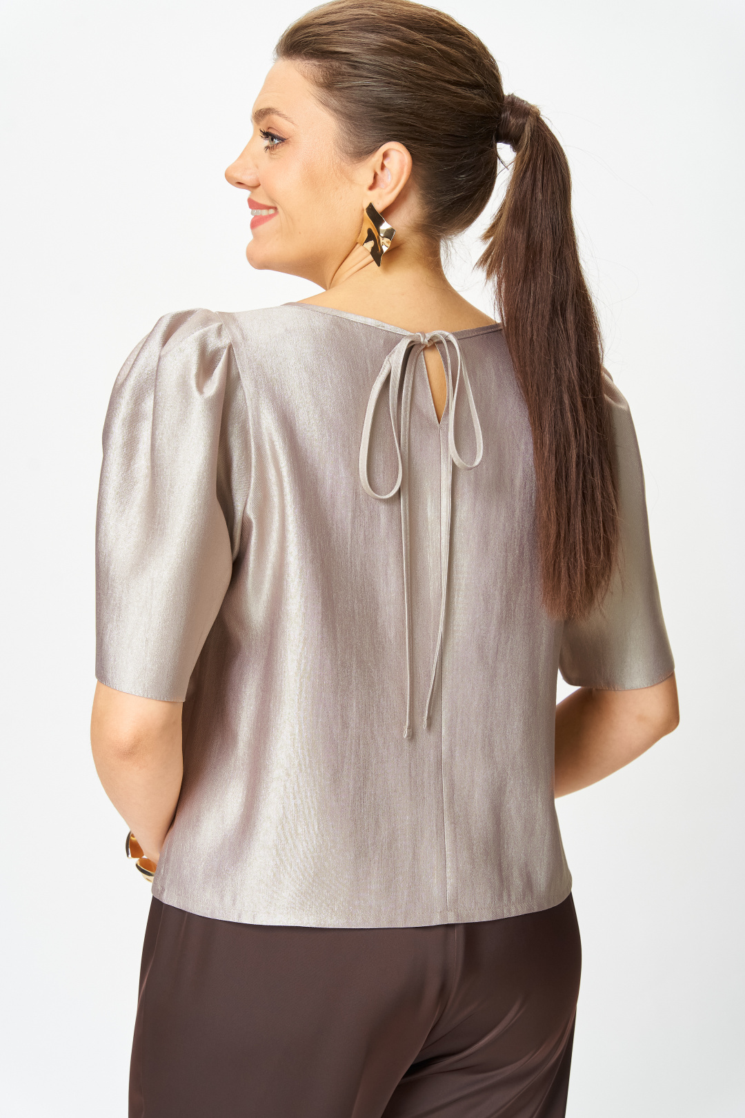 Блузка свободного силуэта из плательной ткани с блеском. Горловина круглая, по спинке в центральном шве разрез возле горловины с завязками.