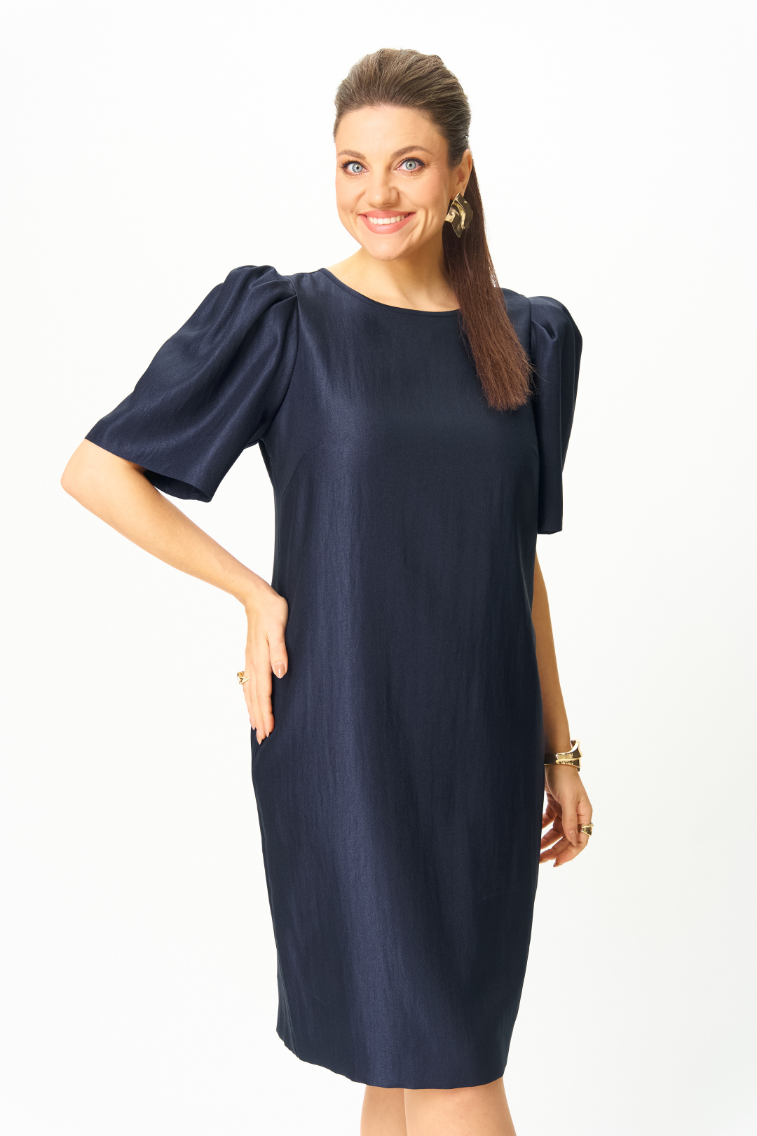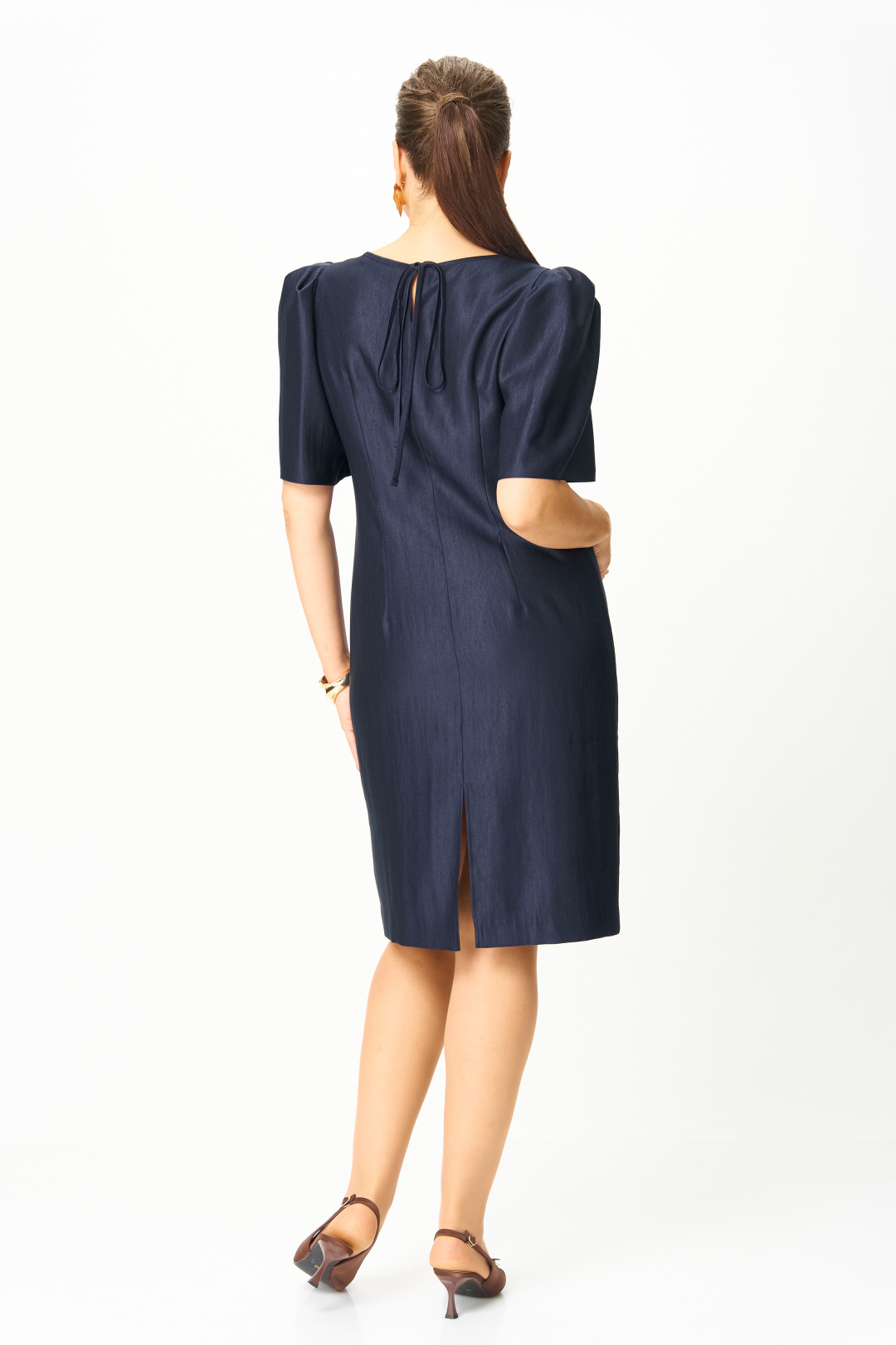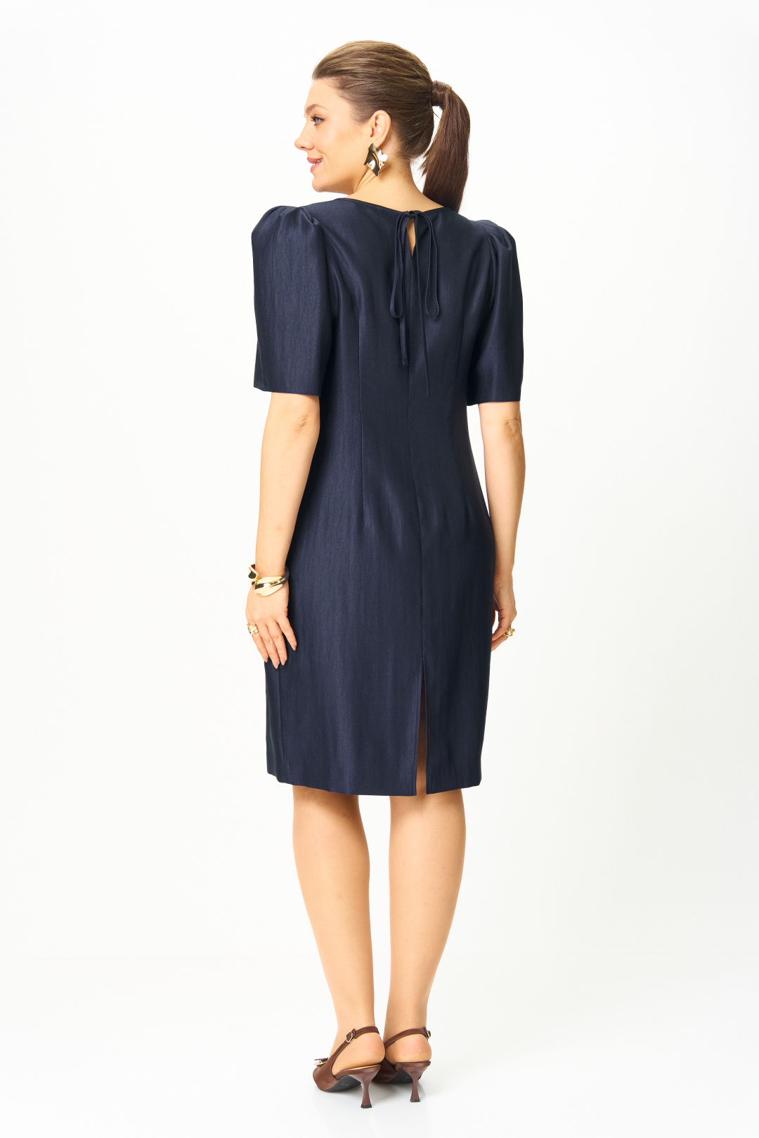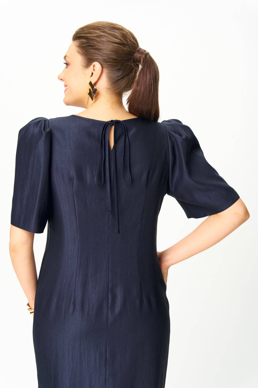 Платье полуприлегающего силуэта, горловина круглая. По спинке в центральном шве разрез возле горловины с завязкой и разрез по низу.