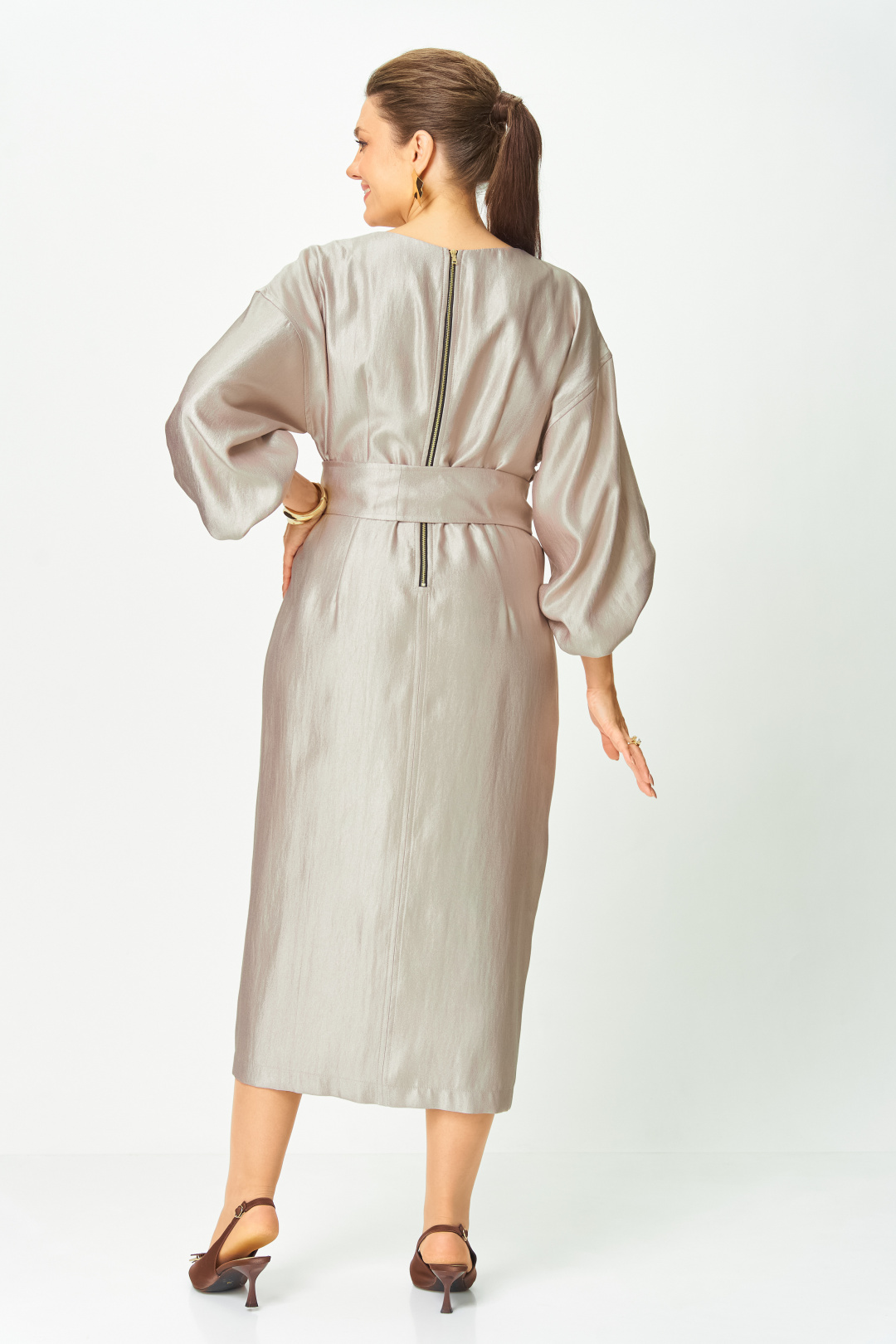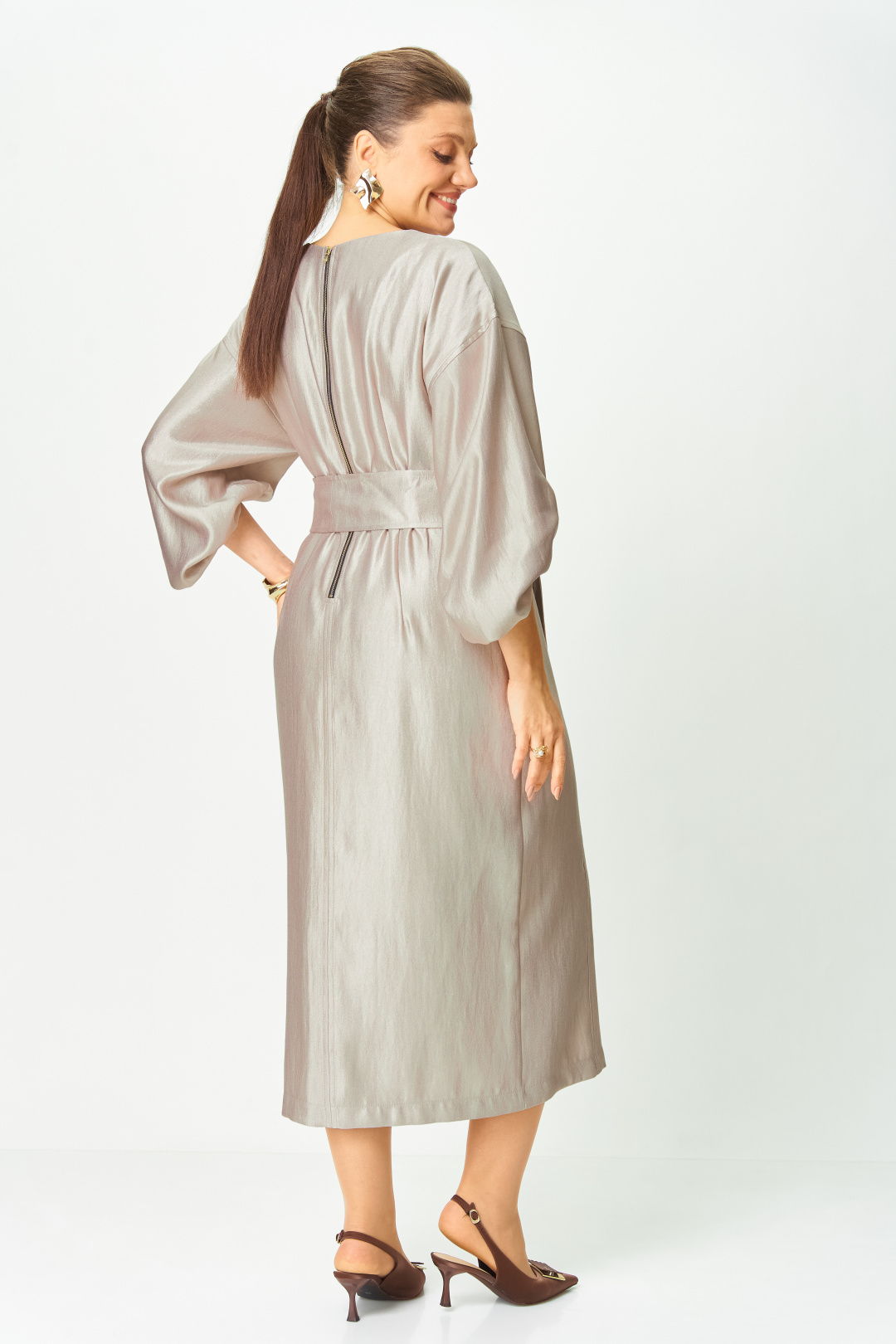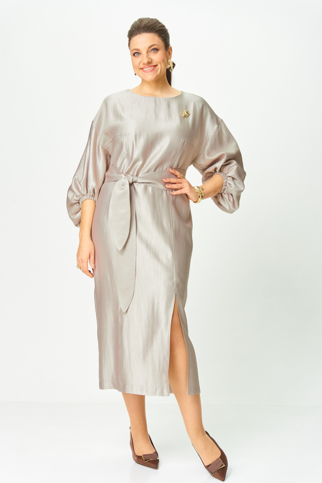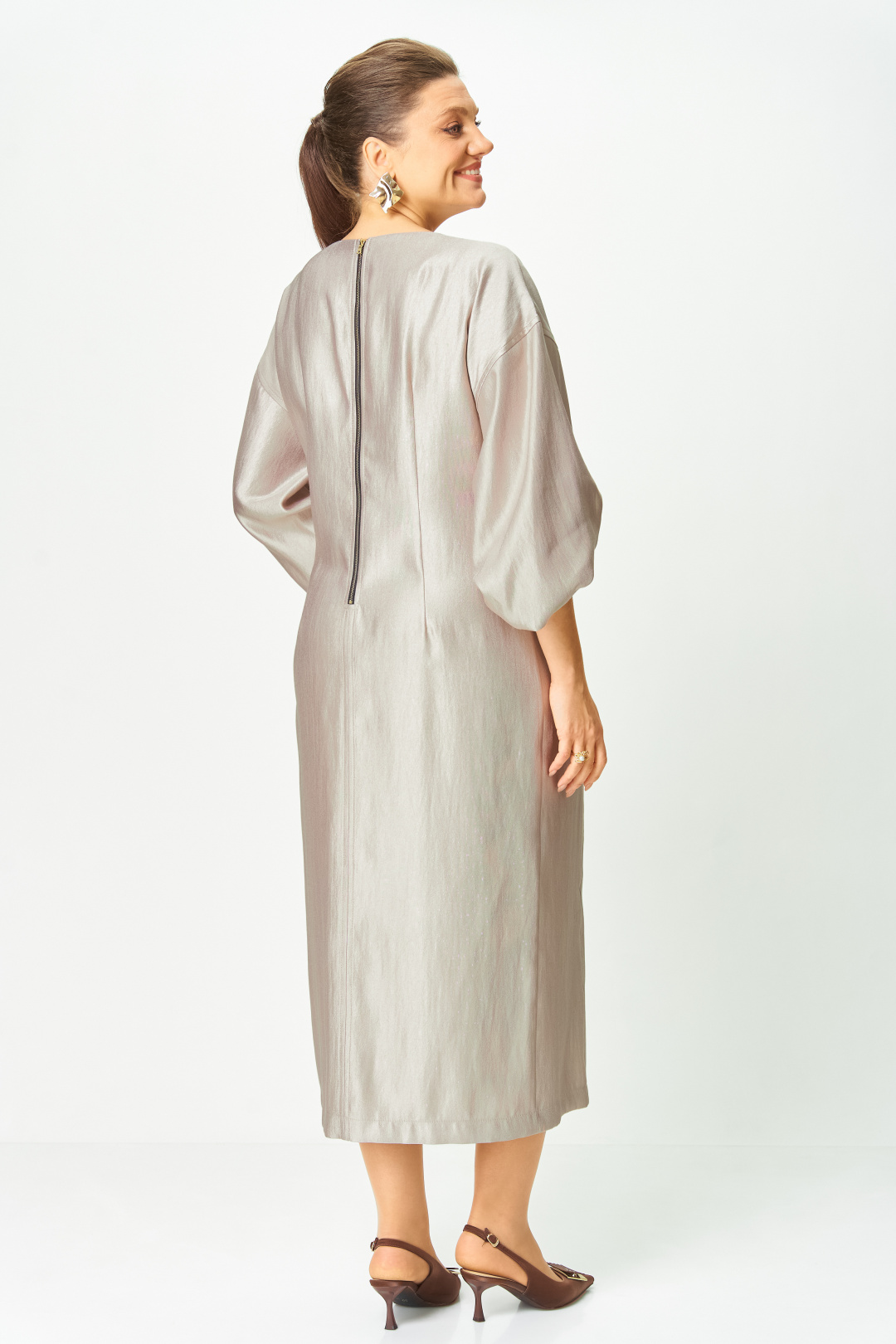 Платье прямого силуэта, с отрезными бочками и разрезом по низу платья. Застежка на декоративную молнию в центральном шве спинки. Горловина круглая. Рукава со спущенной проймой. Рукав широкий, с асимметричным низом, собранным на резинку.