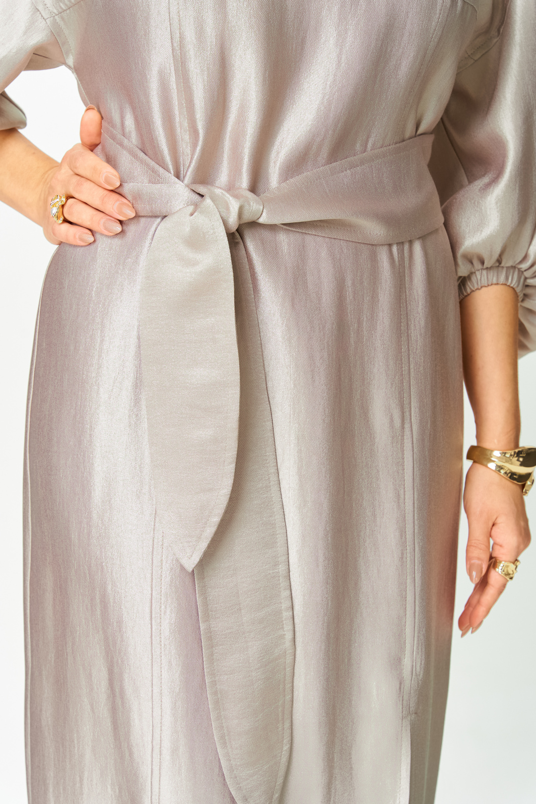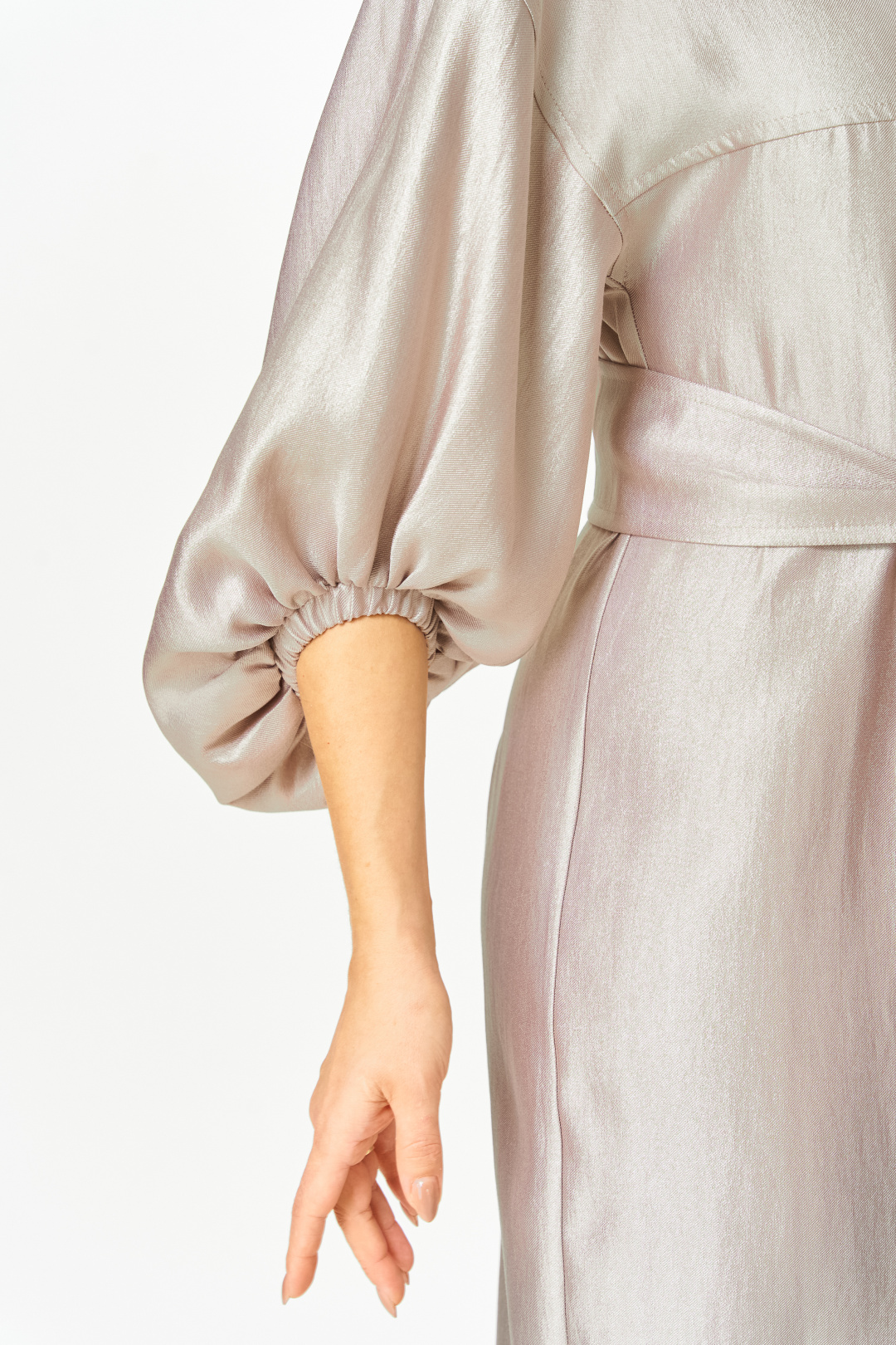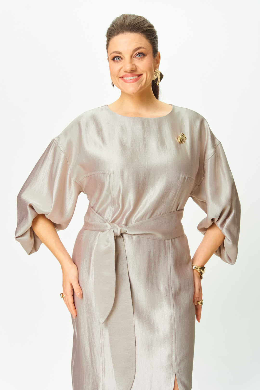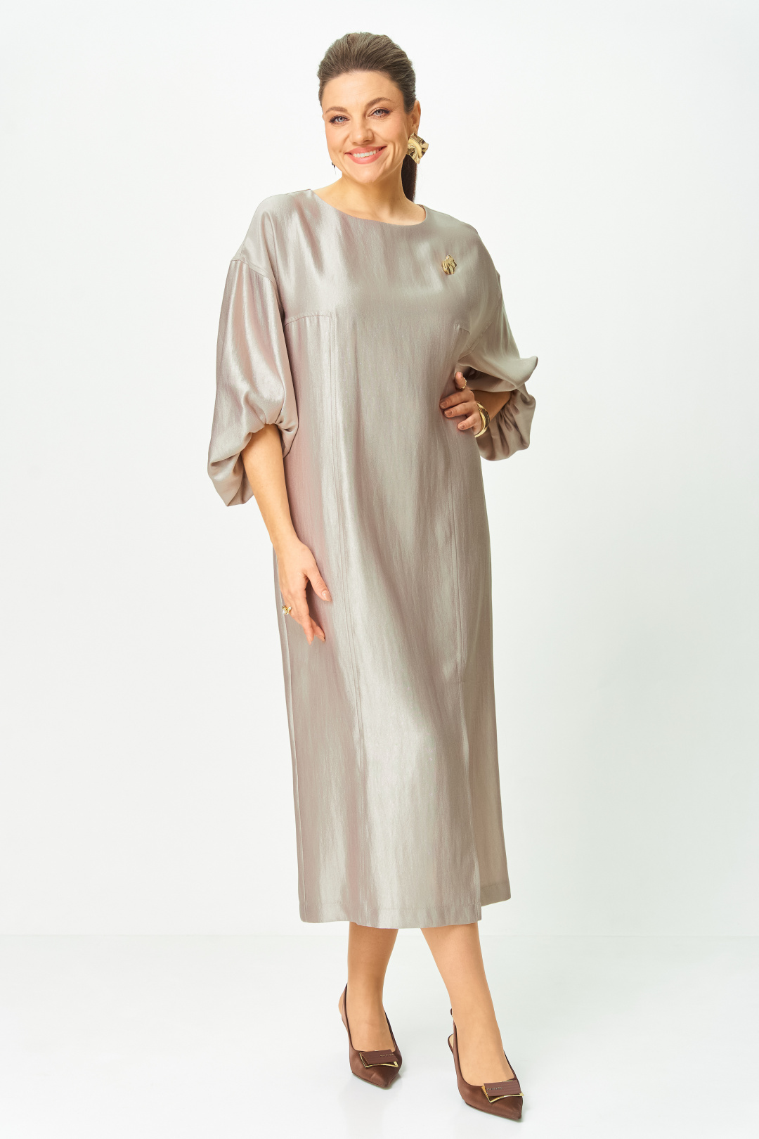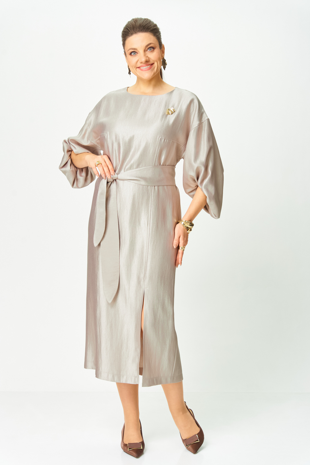 Платье прямого силуэта, с отрезными бочками и разрезом по низу платья. Застежка на декоративную молнию в центральном шве спинки. Горловина круглая. Рукава со спущенной проймой. Рукав широкий, с асимметричным низом, собранным на резинку.