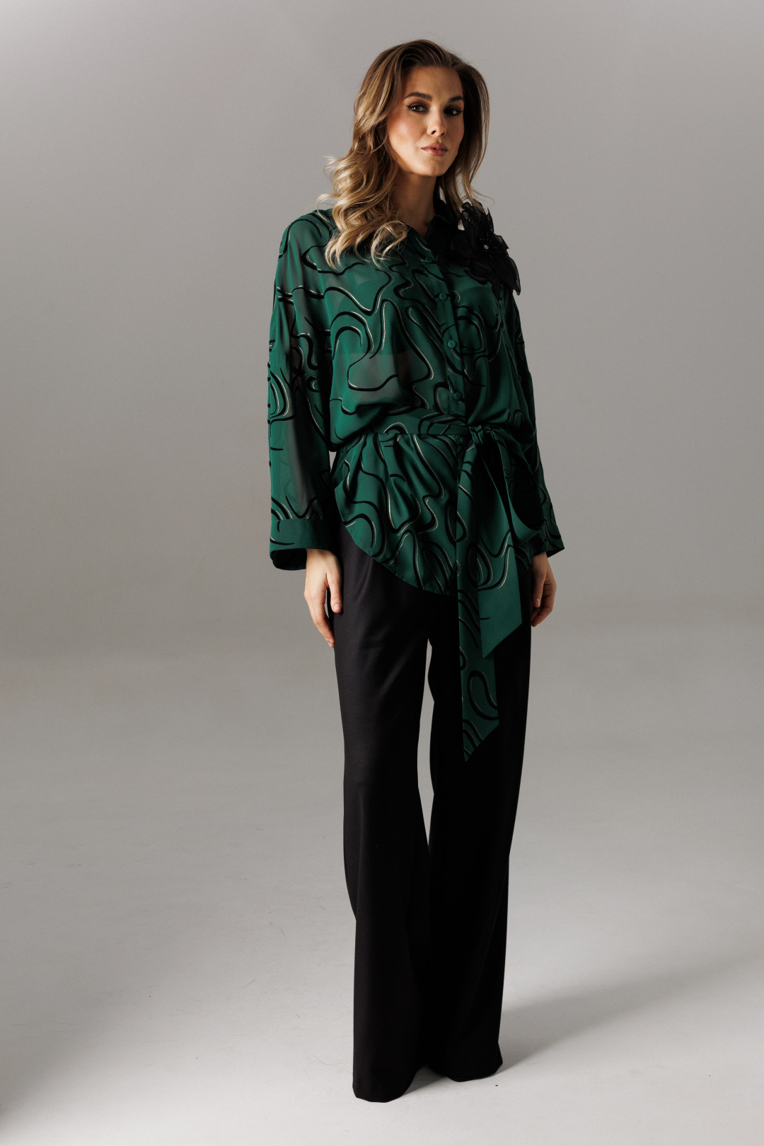 Блуза дополнена съемным поясом для подчеркивания силуэта комплекта.