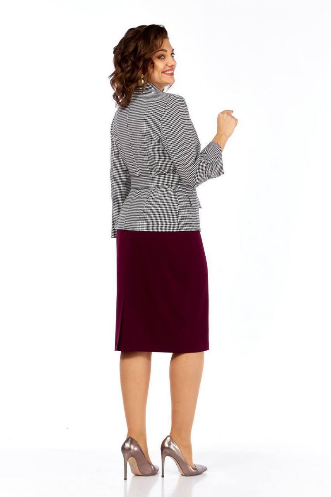 Костюм женский, состоящий из жакета и юбки. Жакет полуприлегающего силуэта, с двубортной застежкой на петли и пуговицы. Воротник пиджачного типа. По переду - рельефный шов, нагрудная вытачка и клапан. Спинка со средним швом и талиевыми вытачками .Рукав двухшовный, по низу которого - разрез. Жакет на частичной подкладке (по переду). В качестве дополнения предполагается пояс. Юбка-карандаш прилегающего силуэта. По переду и спинке-талиевые вытачки. В среднем шве спинки - застежка на потайную тесьму-молнию и шлица. Юбка на подкладке. Длина по спинке - 59 см, длина рукава - 51 см. Длина юбки - 66 см